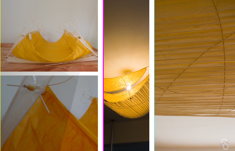 Lampe "Fisch" ALENA WILLROTH Konzept/Design/Produktion2009 Diese Lampe besteht aus zwei Ebenen. Davon ist eine aus Klebeband beschaffen und die andere aus Faserseidenpapier. Zusammengehalten wird die Lampe mit Peddigrohr.